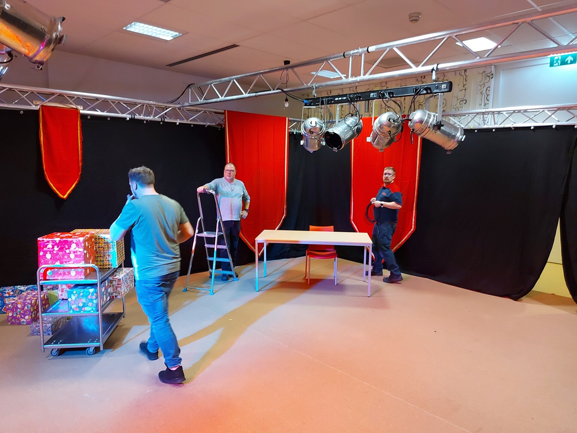 Vrijdag 20 november bouwden we onze studio in Krakeel, Hoogeveen voor de Live uitzending die we 21 november verzorgen. Een heel interactief programma waarbij de kinderen toch nog een beetje in contact konden komen met Sinterklaas.